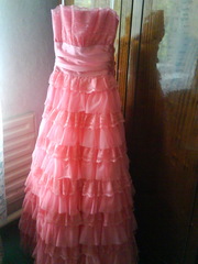 Продам вечернеебальное платье. Розового цвета, лиф на косточках, без бретелек, сбоку молния, пояс атласный-сзади бант. Платье из оборок кружева. Есть подъюбник. В отличном состоянии.