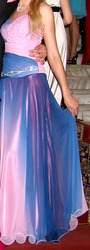 Шикарное бальное платье с плавными переходами от розового к синему, очень нежное и красивое. Верх - корсет, спереди усыпан синими камнями, сзади - розовый. Низ очень пышный.
