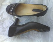 Кожаные женские туфли, на небольшом каблуке (5 см), 36 размер (полномерка), литая подошва. На носке 6 стразиков и пряжечка, на пятке нашивка из натурального замша. Подошва не потертая (обуты 2 раза), набойки заводские в нормальном состоянии.