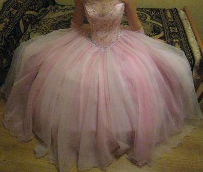 Нежно-розового цвета. Б/у (1 раз надето). Размер регулируется (на корсете). Верх вышит и расшит бисером. Пачка. В комплекте фата, перчатки, подъюбник. |