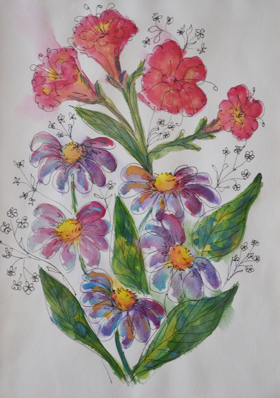 акварель, акварельная бумага, тушь, маркер, рамочка, цена 50 дол , формат 30*40. |