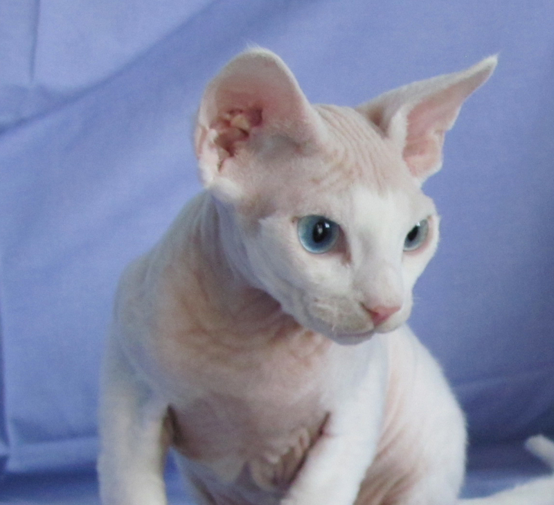 Питомник продает котенка шоу - класса породы девон-рекс. Пол - мальчик, цвет - белый, с голубыми глазами. Дата рождения - 11 мая, воспитан, имеет родословную, приучен к лотку и когтеточке, очень ласковый и послушный. Котенок с родословной, от титулованных родителей. |