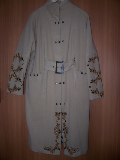 Продам пальто демисезонное на подкладке. Вышивка ручной работы. Рукав летучая мышь. Воротник стойка. Длина 108см. Длина рукава от плеча 63см. Размер 46-48. |