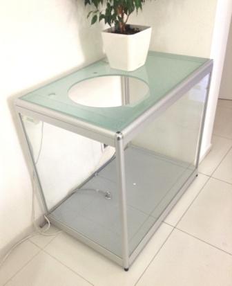 Стол-тумба под мойку. Размер – ш*гл*в - 1000*650*900 мм. Конструкция: передняя стенка и две боковые выполнены из прочного стекла h=5 мм, задняя стенка отсутствует (есть возможность доукомплектовать дверцами). Столешница выполнена из высокопрочного стекла – h=10 мм, нижняя часть – ДСП, материал соединений - алюминиевые уголки. В столешнице проделано три отверстия – первое диаметром 410 мм, второе – 30 мм и третье – 20 мм. Использовался как торгово-выставочное оборудование. Можно использовать в качестве выставочного стенда или же в домашних условиях непосредственно в качестве тумбочки под мойку. Состояние – отличное. |