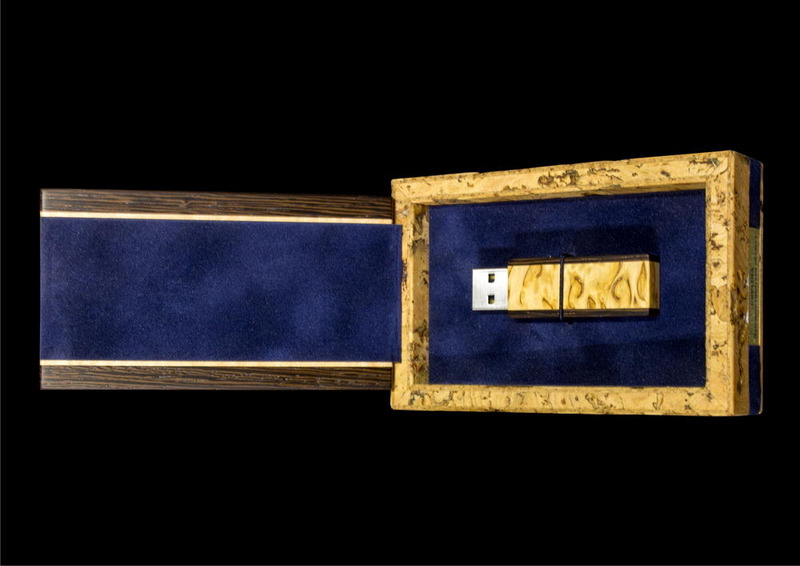 Флешка сплошь покрыта эксклюзивными породами натуральной древесины Карельской березы и Черного дерева Венге. Работа выполнена в ручную, по размерам индивидуального электронного носителя. Верхняя и нижняя сторона, изготовлена из знаменитой Карельской березы, которая своей необычной текстурой напоминает срез камня, а своей теплотой солнечного света всегда будет радовать человеческий глаз, особенно в пасмурную погоду. Боковые части флешки набраны изящным поперечным поясом из черного дерева Венге. Сама флешка уютно расположилась в индивидуальном футляре ручной работы. Основной материал который применен для изготовления данного футляра это натуральное Пробковое дерево. Верхняя крышка футляра при закрытии мягко фиксируется с помощью двух неоновых магнитов, которые предварительно были инкрустированы в царгу и верхнюю крышку изделия. Особое изящество футляру придают элементы замшевой ткани благородного синего оттенка, очень приятные на ощупь. Продольные стороны верхней крышки имеют две вставки из массива черного дерева, которые в дальнейшем были инкрустированы двумя тонкими жилками из волнистого Клена. Венчает композицию круглый медальон из лучших срезов Королевского Тополя, который инкрустирован в замшевую ткань. На самом медальоне выполнена роспись маслом в ручную. Фирменная эмблема национальной культуры Украины – Петриковка. Техника «Петриковская роспись» оценена 600 экспертами из 95 стран мира входящих в состав комитета ЮНЕСКО которые присвоили ей статус нематериального культурного наследия. Вся древесина применяемая в данном изделии предварительно обработана воском пр-во Италия. На передней части царги из пробки, имеется именной шильдик из латуни с надписью Украина Днепропетровская область. Этот шильд можно использовать для индивидуальной подписи или даты по вашему усмотрению. Базовая модель электронного носителя 4Gb. По желанию возможно увеличение до 32 Gb.