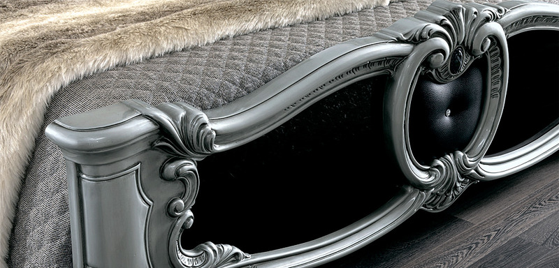 Античная отделка серебром на кроватях и элементов декора подчеркивает уникальность и эксклюзивность дизайнаитальянской мебели для спальных комнат "Барокко Блэк" фабрики Camelgroup.