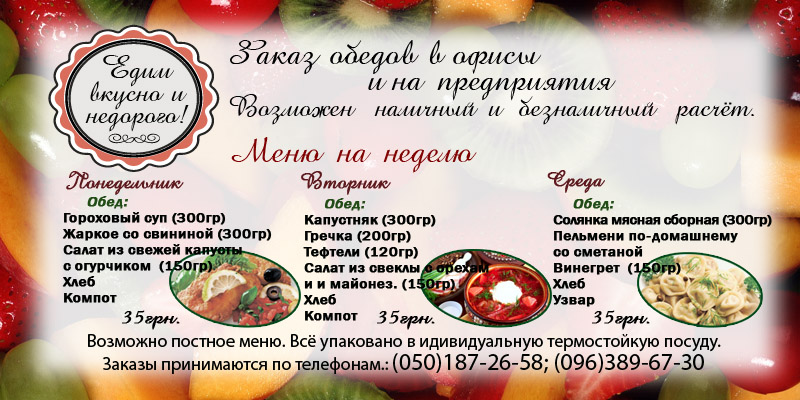 Бесплатная доставка комплексных обедов по городу. Каждый день новое меню.Ждем ваших заказов. |