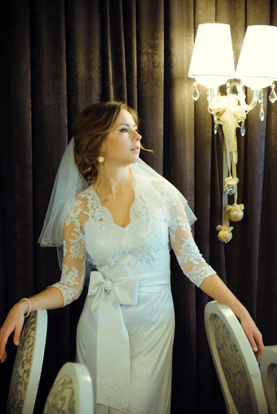 Платье шито на заказ из франц узких тканей и шикарного объемного итальянского кружева, с подлетными кристаллами Swarovski разных размеров, рукав 3/4, спинка застегивается на перламутровые пуговицы (см. фото 2, фото 4), сзади на юбке кружевной клин,который не только украшает, но и дает неограниченность в движениях для невесты, что очень удобно. Цвет - белоснежный. Размер: М, рост - 165( каблук 12см), мои мерки при пошиве - Обхват груди - 87,обхват талии - 68,обхват бедер - 88. Одето 1 раз. Состояние - идеальное, после качественной химчистки. |