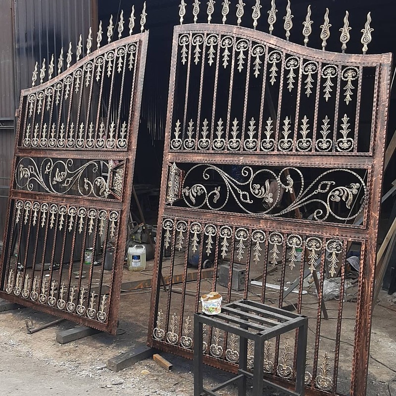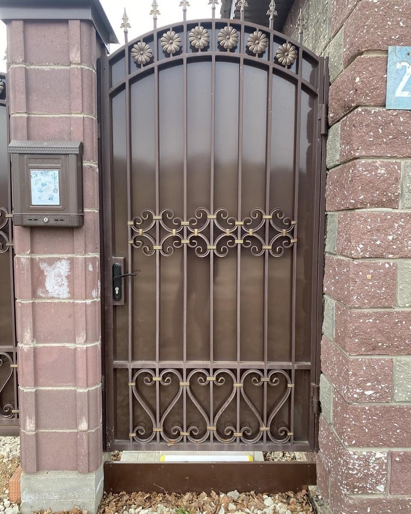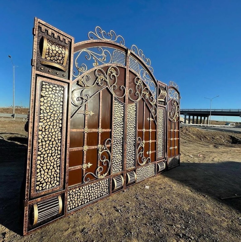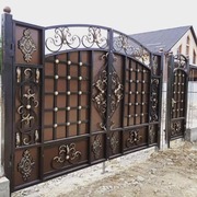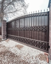 Метал ворота на заказ гаражные и въездные, ровные и витые, сложные и простые, несложные и кованые металлические ворота с замечательной ковкой оригинальной в мастерском исполнении дизайнерского подхода, дорогие и дешевые бюджетные, ровные и арочные, глухие с прозрачными смотровыми решетками, гаражные в гараж а дверью, автоматические въездные во двор с калиткой, с пиками, со столбиками. Купить просто с профлиста и кованые ворота откатные, распашные, подъемные, сдвижные. Можно выбрать металл 3 мм, 2 мм, 1,5 мм, каркас и профлист, цвета, замки, задвижки. Иллюстрация работ на фото строительного сайта 004.
