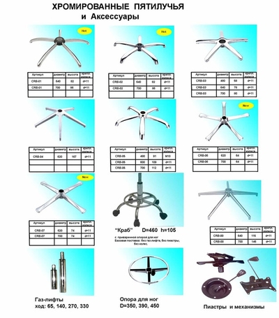 Крестовины, пятилучья, газ-лифты, пиастры, подлокотники, подножники, ролики, колеса, поворотные базы для кресел, каркасы для конференц-кресел, основы для барных стульев. Доставка по всей Украине. |